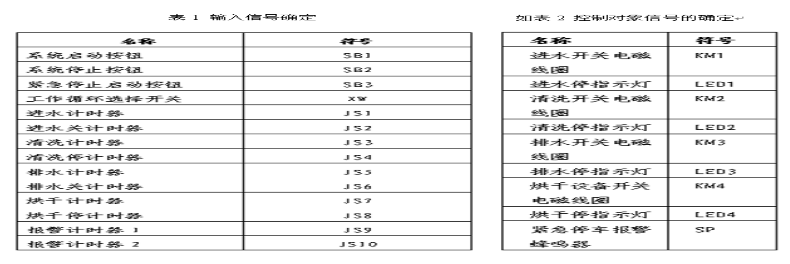 由于設計的是全自動的清洗器, 所以使用可編程序控制器(PLC)控制整個清洗過程,同時,發生故障時能夠做到緊急停止清洗。超聲波清洗器的輸入控制信號由點動按鈕提供, 通過PLC內部計時器提供計時功能從而提高控制系統的可靠性、精準度及靈敏度,從而實現整個清洗過程的全自動控制。輸入信號如表 1 所示: