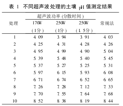 超聲波分散法測定土壤 pH 值結果, 酸性土壤與常規法差異不大, 但堿性土壤隨著超聲波功率的增大和時間的延長其結果有偏低的趨勢。與常規法比較, 超聲波功率 170 W分散 1分鐘處理的相對誤差為 0 . 01 % ~0 . 12 % , 250 W 1分相 對誤差 為 0 . 03 % ~0 . 13 % , 250 W 1 . 5分相對誤差為 0 . 02 % ~0 . 25 % 。 前兩者的誤差值均小于 pH 值平行測 定結果 允許 誤差 0 . 10 % ~ 0 . 20 % , 以170 W 分散 1分**佳 (見表 1)。