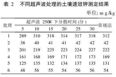 超聲波法在 250 W、 5分鐘條件下測定速效鉀, 低鉀含量土壤的測定結果基本達到允許誤差要求, 但高鉀含量的土壤結果偏低。