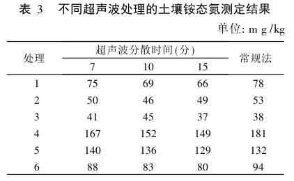 超聲波法測定銨態氮表明, 與常規法比較, 在 250 W 下分散 7分鐘的相對誤差為3 . 8 % ~ 7 . 9 % , 10分為 3 . 0 % ~ 18 . 4 % , 15分為 2 . 3 % ~ 17 . 7 %。 與平行測定結果允許相對誤差為≤ 10 % 比照, 250 W 分散 7分的處理結果在允許誤差范圍 (見表 3)。