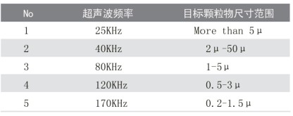 下圖是不同頻率的超聲波所能清洗去除的顆粒物范圍,40KHz的超聲波能清除的顆粒物尺寸范圍**廣,足以去除我們常見的大部分污垢,因此,這一頻率被廣泛使用。隨著頻率的升高,能去除的顆粒物越小,而超聲波的作用力越小。在一些對清洗的潔凈度要求較高的行業,如清洗光學鏡片用于鍍膜,清洗液晶面板、清洗硅晶片等,我們通常采用多頻率多槽多步驟清洗,逐級去除顆粒。    目前市場上的一些變頻超聲波清洗機,理論上可以實現不同粒徑顆粒的清洗,但由于系統過于復雜導致超聲波振子工作效率低,總體清洗效率反而會下降。
