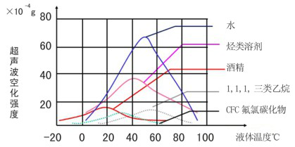 在不同的溶劑、溫度下,超聲波的空化強度及傳導效率是不同的,而空化強度越大,則清洗效率越高。下圖是在不同溶劑中,溫度與超聲波空化強度的關系,由圖看出,當水溫在50°C左右時,超聲波的空化強度**高。因此,用水劑進行超聲波清洗時,**佳溫度應是40-60°C。